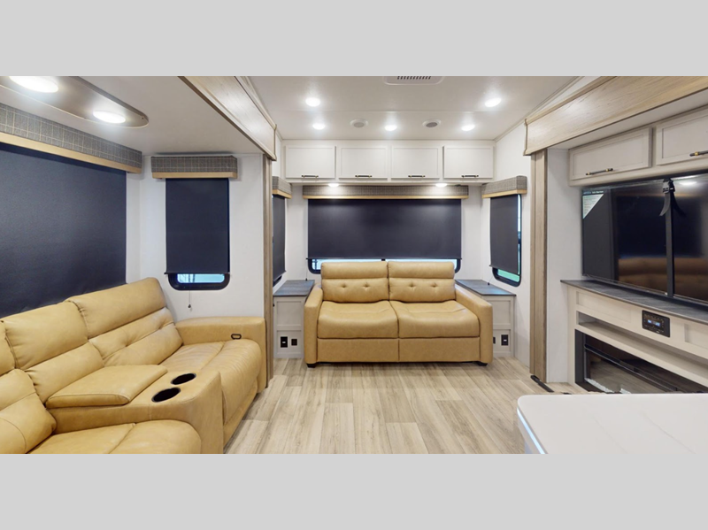 Sleeps 4 Slides 3 Length 38 ft 11 in Ext Height 12 ft 6 in Interior Color Bayport, Lexington Hitch Weight 2525 lbs Dry Weight 11175 lbs Cargo Capacity 2325 lbs Fresh Water Capacity 46 gals Grey Water Capacity 78 gals Black Water Capacity 39 gals Furnace BTU 30000 btu Available Beds King Refrigerator Type 12V Refrigerator Size 10 cu ft Cooktop Burners 3 Number of Awnings 2 LP Tank Capacity 30 lbs Water Heater Type Tankless TV Info LR 40" LED TV Awning Info 13' and 14' Power with LED Lights Axle Count 2 Washer/Dryer Available Yes Number of LP Tanks 2 Shower Type Walk-In Shower Electrical Service 50 amp Similar Floorplans