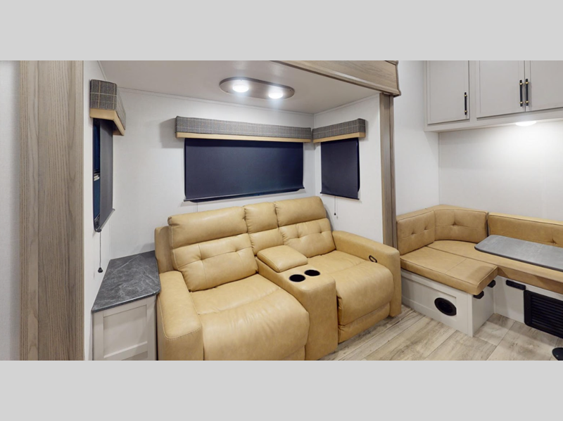 Sleeps 3 Slides 2 Length 31 ft 8 in Ext Height 11 ft 11 in Interior Color Bayport, Lexington Hitch Weight 1550 lbs Dry Weight 8344 lbs Cargo Capacity 1256 lbs Fresh Water Capacity 44 gals Grey Water Capacity 78 gals Black Water Capacity 39 gals Furnace BTU 30000 btu Available Beds King Refrigerator Type 12V Refrigerator Size 10 cu ft Cooktop Burners 3 Number of Awnings 2 LP Tank Capacity 30 lbs Water Heater Type Tankless Awning Info 18' Power with LED Lights Axle Count 2 Washer/Dryer Available Yes Number of LP Tanks 2 Shower Type Walk-In Shower Electrical Service 50 amp Similar Floorplans