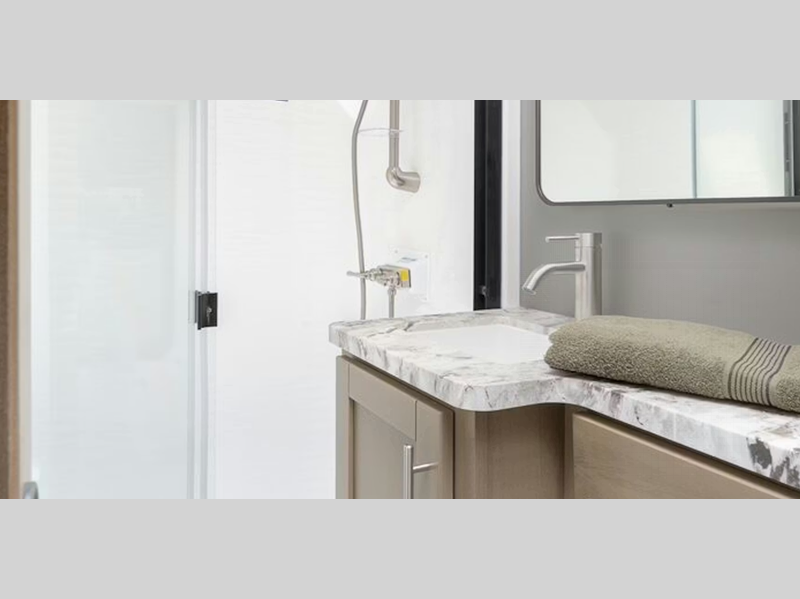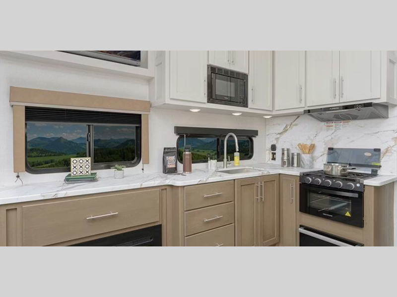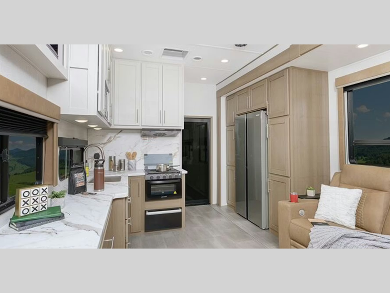 Each model features large tinted safety glass windows, furrion wireless backup camera prep, and a wide-body construction to fit your favorite toys on board. Inside, you will love 5K lbs. frame welded tie-downs, new larger shower, and 12V refrigerator. Also, check out the beautiful interior designs and additional sleeping space for guests!